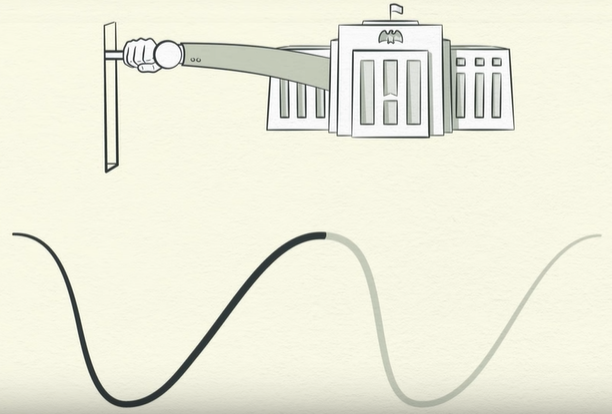 央行不希望通货膨胀过高,因为这会导致许多问题。央行在看到价格上涨时就会提高利率,随着利率上升,有能力借钱的人就会减少,同时现有的债务成本也会上升,就等于你每个月的信用卡还款额会增加。由于人们减少借债,还款额度增长,剩下来用于支出的资金就减少,因此支出速度放慢,而由于一个人的支出是另一个人的收入,环环相扣,人们的收入将下降。由于支出减少价格将下跌,我们称之为通货紧缩,经济活动减少,经济便进入衰退。如果衰退过于严重,而且通货膨胀不再成为问题,央行将降低利率,使经济活动重新加速。