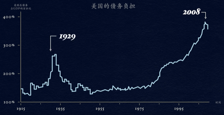 但是这种情况显然无法永久持续下去,也确实没有持续下去,几十年来债务负担缓慢增加使偿债成本越来越高,到了一定的时候,偿债成本的增加速度超过收入,迫使人们削减支出。由于一个人的支出是另一个人的收入,收入开始下降。人们的信用因此降低,致使借贷减少,偿债成本继续增加,使得支出进一步减少。周期开始逆转,这时到达长期债务的顶峰,债务负担变得过重。